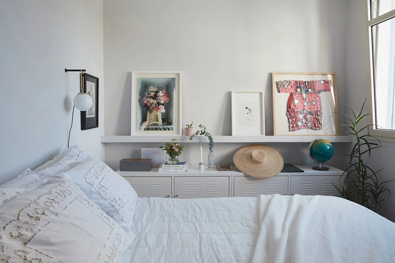The two large columns in the main area, were exposed, to obtain an honest and coherent feel of materiality. The kitchen was partly left as it was, with some minor adjustments to the new tenants’ needs and style. The wooden floors in the bedrooms were kept as well. A clean and distinct design aims to complement the eclectic atmosphere of this Mediterranean home.